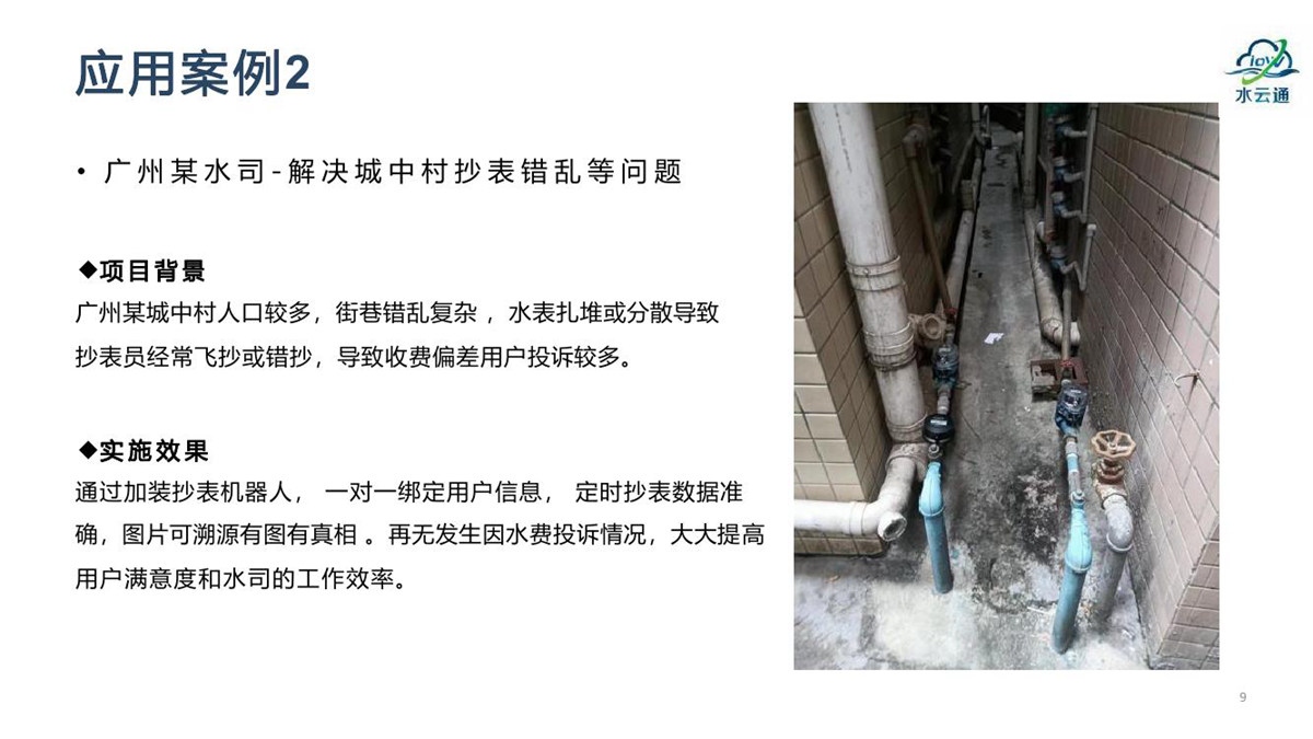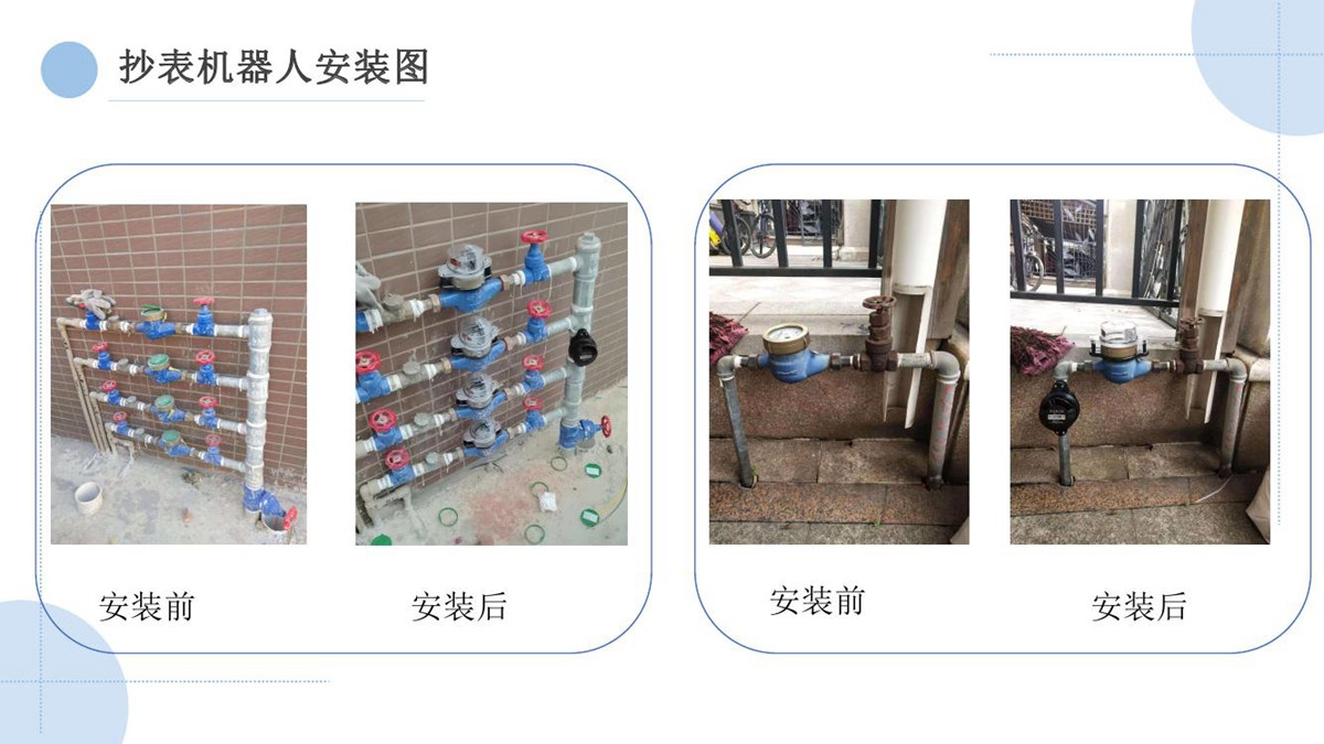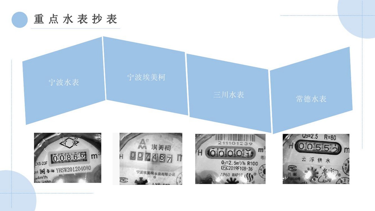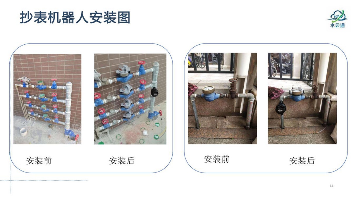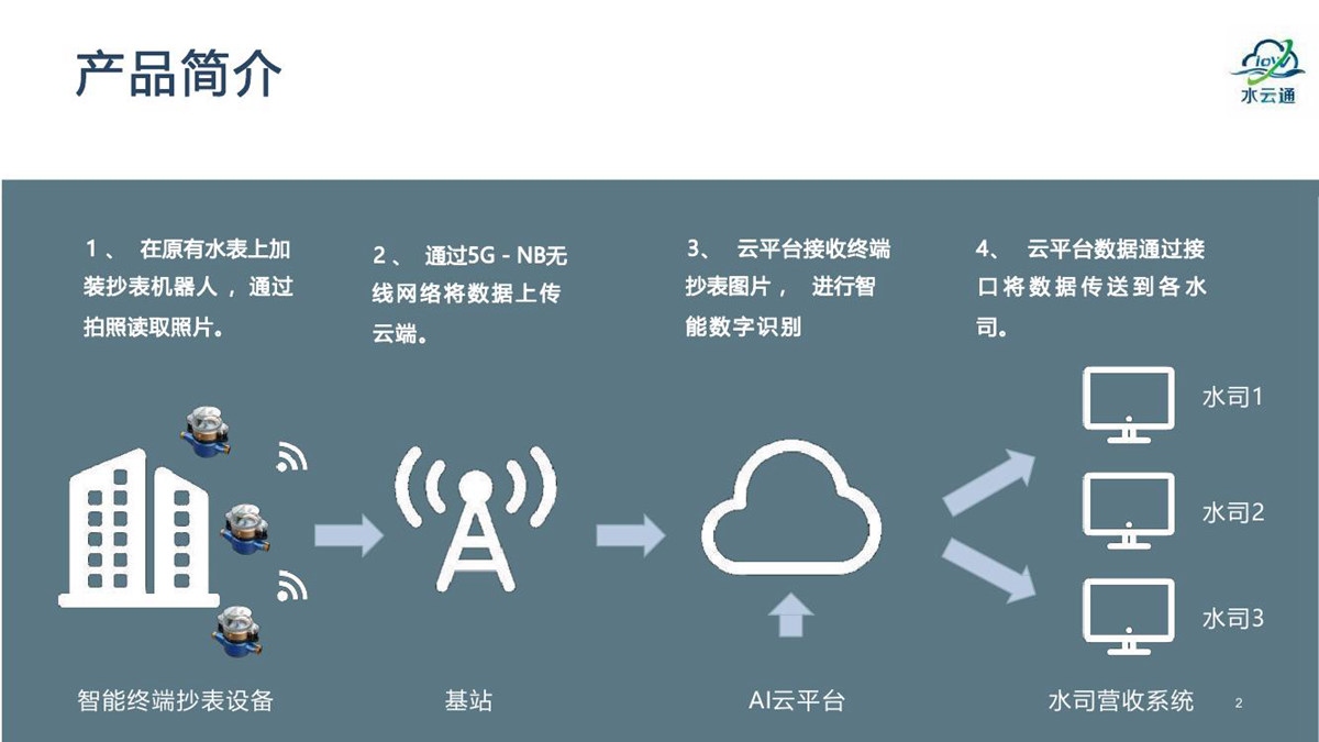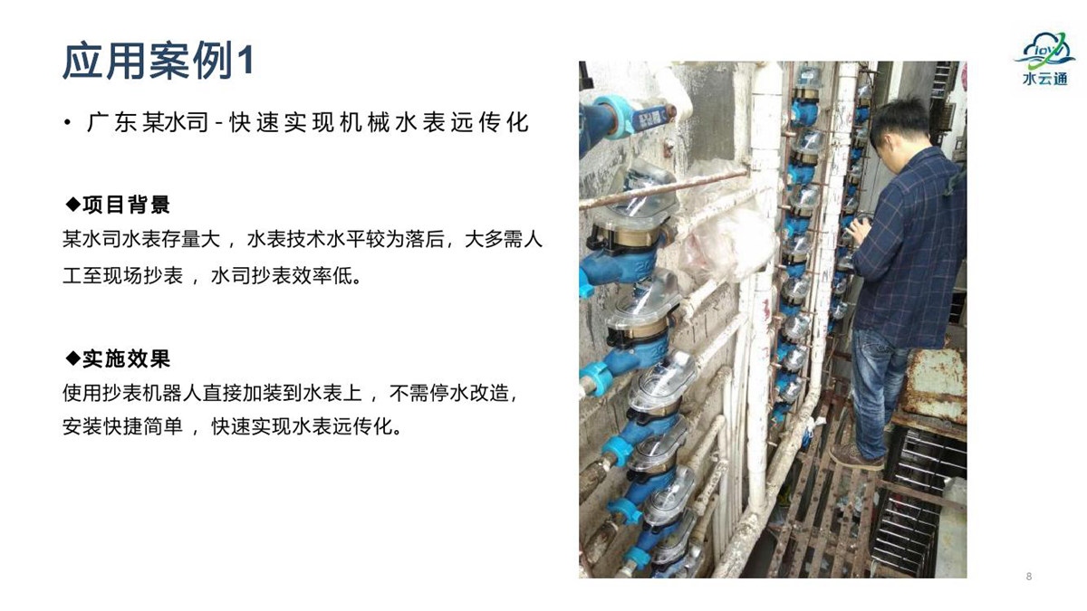 “水云通”抄表机器人,采用抄表机器人+云平台+应用平台的系统架构,无需停水的情况下在用户原有水表上加装抄表机器人,拍照采集上传抄表图片,通过系统后台AI智能识别出抄表读数。