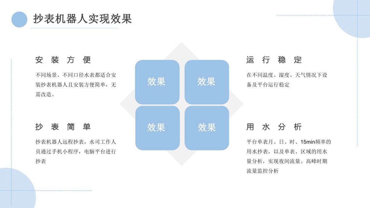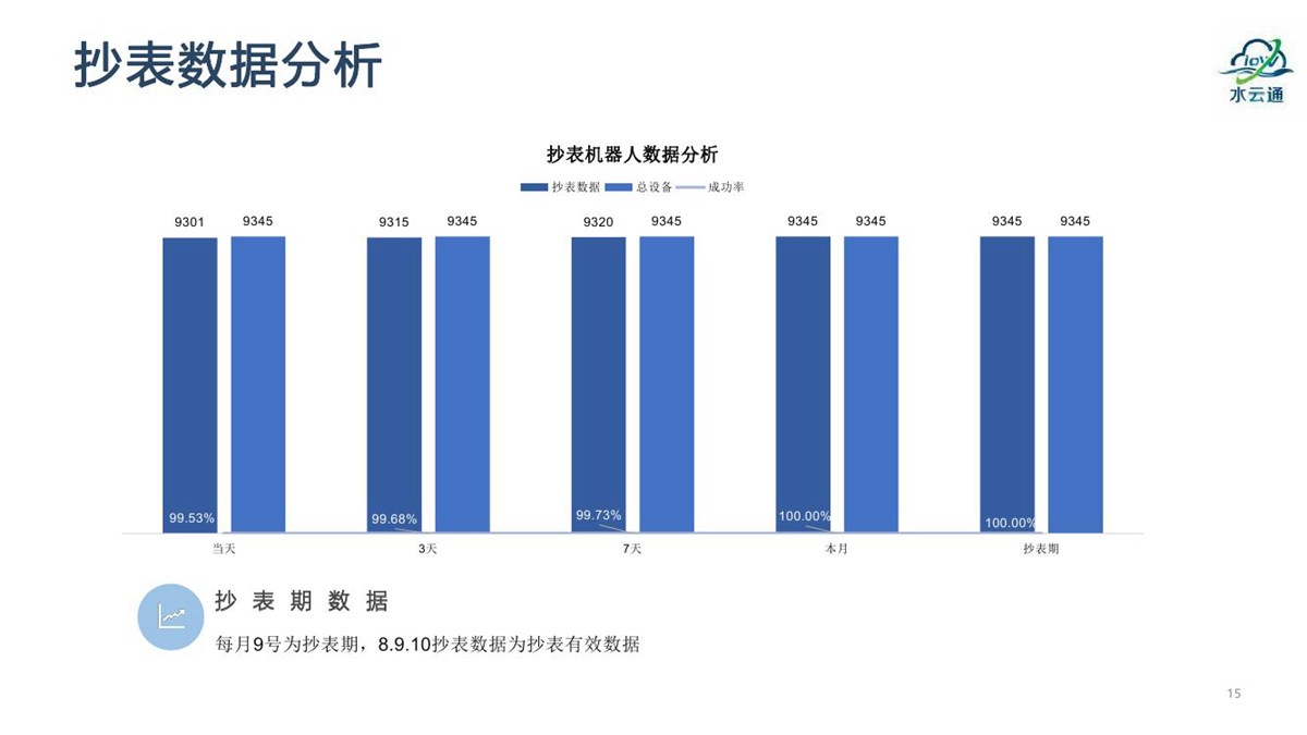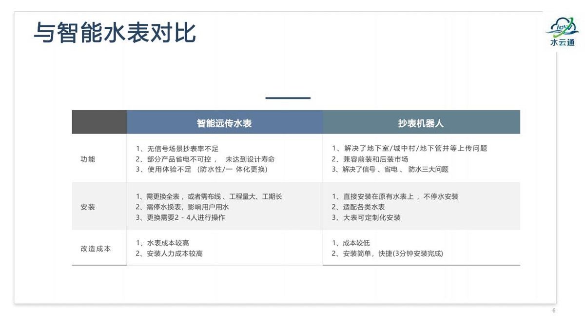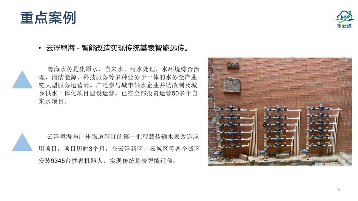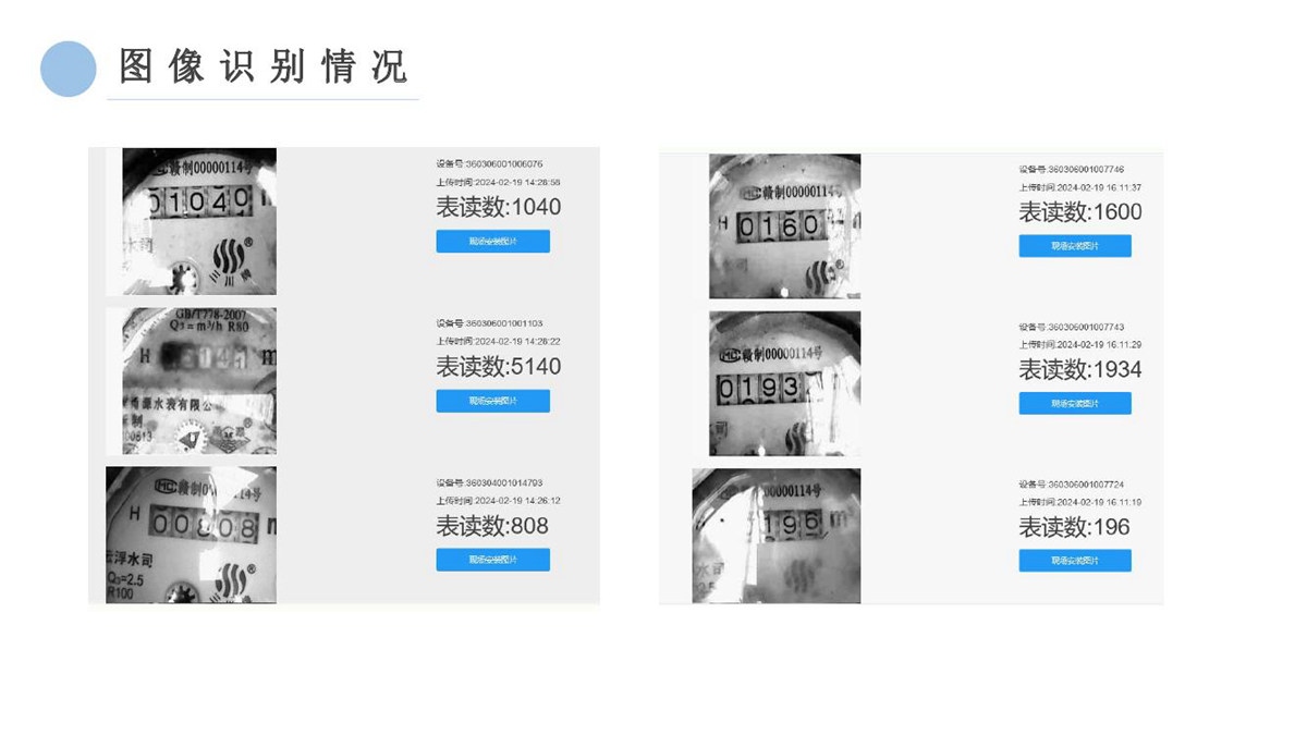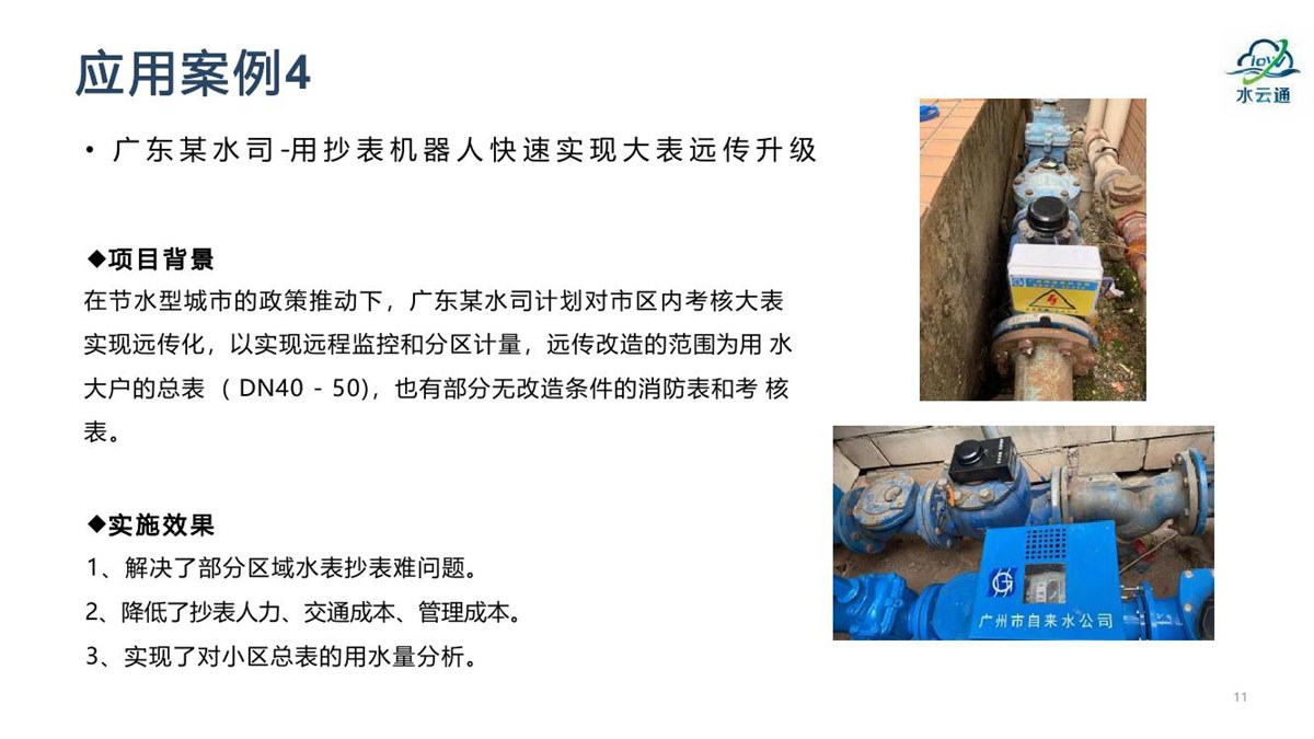 “水云通”抄表机器人,采用抄表机器人+云平台+应用平台的系统架构,无需停水的情况下在用户原有水表上加装抄表机器人,拍照采集上传抄表图片,通过系统后台AI智能识别出抄表读数。